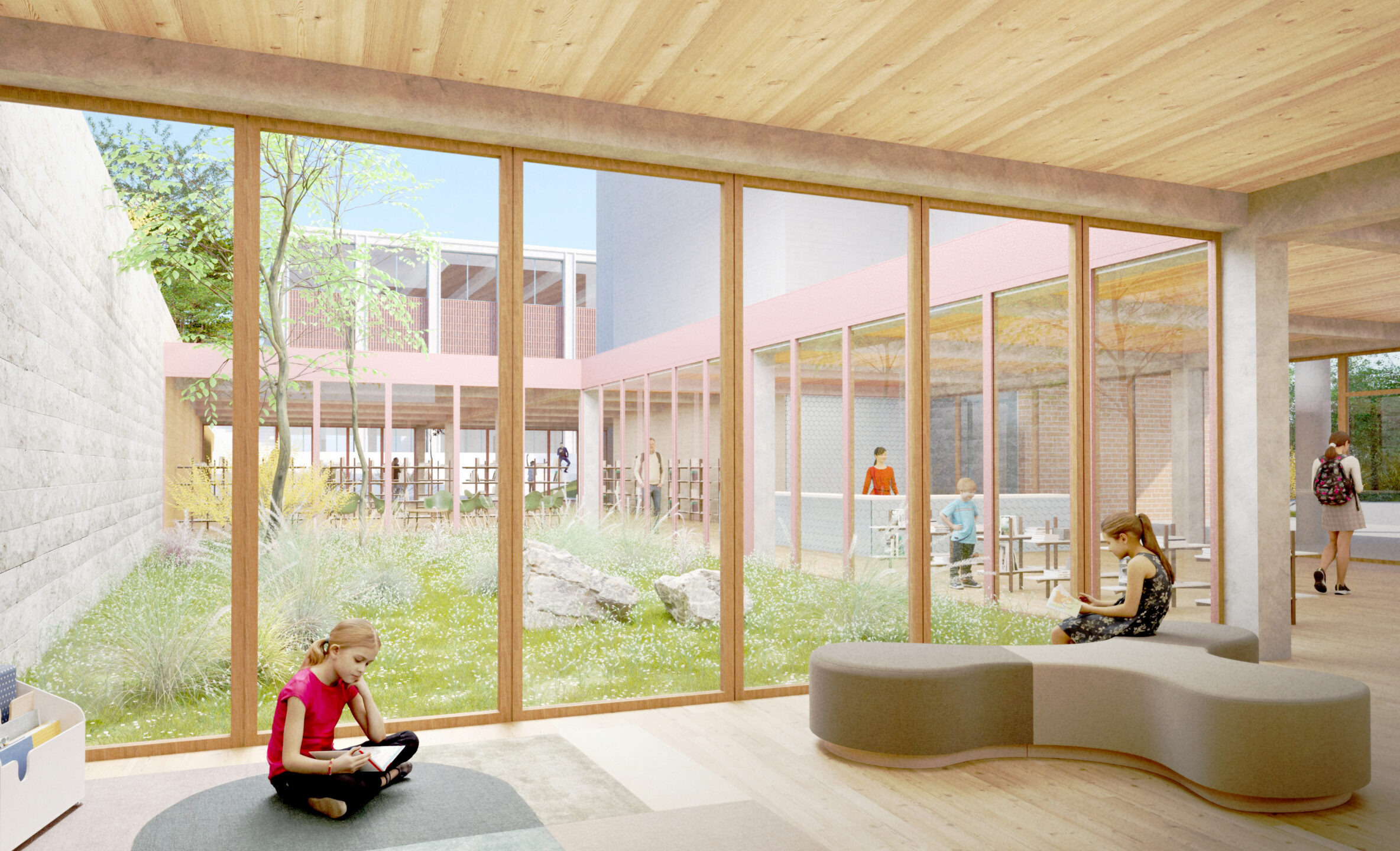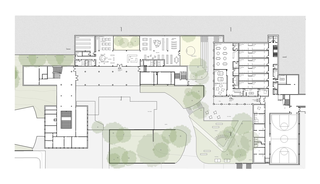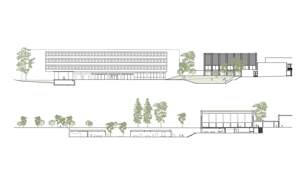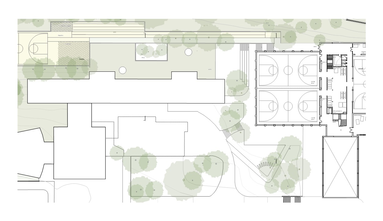 Le projet prévoit la construction de deux salles de gymnastique, d’un accueil parascolaire et d’une bibliothèque pour le site scolaire de Béthusy à Lausanne. Le projet prend place dans la partie nord du campus afin de préserver les espaces ouverts et les qualités paysagères du site. Sa forme simple et compacte s’inscrit naturellement dans la composition existante en renforçant l’organisation du complexe sportif. Le principe constructif associe une structure poteaux-poutres en béton à des éléments en bois massif, selon le principe du « bon matériau au bon endroit ».